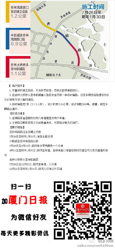 廈門北站路網(wǎng)提升施工中的杏錦路改造部分正式開工。此次杏錦路改造將分三個(gè)段落分別開展施工,總工期將持續(xù)到明年1月30日。杏錦路將由目前的雙向六車道增至雙向十車道,主要路口都將實(shí)現(xiàn)立交或者通道化,可實(shí)現(xiàn)全程無(wú)紅綠燈