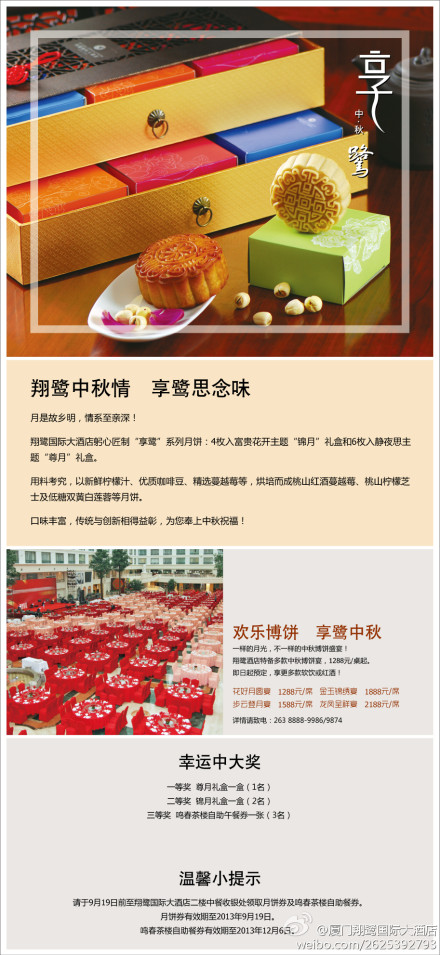 廈門翔鷺國際大酒店:月是故鄉(xiāng)明,情系至親深!翔鷺酒店躬心匠制168元/盒4枚入“錦月”禮盒和258元/盒6枚入“尊月”禮盒。以新鮮檸檬汁、優(yōu)質(zhì)咖啡豆、精選蔓越莓等,烘培而成桃山紅酒蔓越莓、桃山檸檬芝士及低糖雙黃白蓮蓉等月餅。 口味豐富,傳統(tǒng)與創(chuàng)新相得益彰,為您奉上中秋祝福!另有多款博餅宴1288元/桌起!