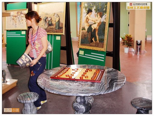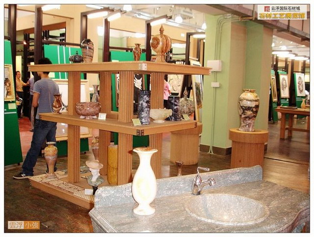 產(chǎn)品展示大廳,征集、收藏展品共計1000多件(套)。栩栩如生的石雕人像和動物雕塑,精工巧制的圓柱,石線、欄河等異型工藝品,鬼斧神工的云石天然畫,自然樸實的文化石,各種各樣的國產(chǎn)、進口板材……石鄉(xiāng)文化氣息撲面而來,流光溢彩的石藝精品令人目不暇接。這里集云浮石材產(chǎn)品精粹之大成,集中地體現(xiàn)“云石”加工“高、精、尖、深、巧、新”的特色,堪稱云浮百里石材城的“城中之城”。云浮的石材工藝主要分石雕、石拼圖及裝飾實用工藝三大類,其特色在于“新、巧、精”,構(gòu)思奇特、搭配巧妙,貼近自然,注重形態(tài)和質(zhì)感的和諧。