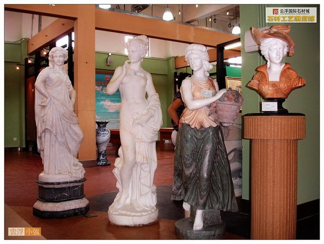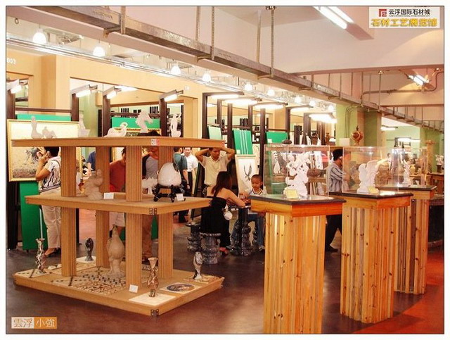 栩栩如生的石雕人像和動物雕塑,精工巧制的圓柱,石線、欄河等異型工藝品,鬼斧神工的云石天然畫,白云山樸自然的文化石,各種各樣的國產(chǎn)、進口板材……石鄉(xiāng)文化氣息撲面而來,流光溢彩的石藝精品令人目不暇接。這里集云浮石材產(chǎn)品精粹之大成,集中地體現(xiàn)“云石”加工“高、精、尖、深、巧、新”的特色,原本平淡無奇的石頭,經(jīng)云浮能工巧匠之手精心雕刻,點化成美侖美奐的工藝石雕,這里的展品匯集了全國乃至全世界的名優(yōu)石板材和各類異形工藝品,代表了云浮石材業(yè)發(fā)展的最高、最新水平?胺Q云浮百里石材城的“城中之城”。薈萃云石精品的工藝展館,已接待來自美國、歐盟、港澳臺和我國各地數(shù)以萬計的游客,正迅速連成為石都假日旅游觀光新亮點。