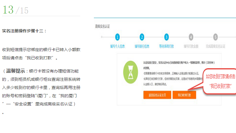 *銀行卡若沒(méi)有辦理短信功能的,須到柜員機(jī)或銀行柜臺(tái)查詢(xún)注冊(cè)系統(tǒng)轉(zhuǎn)入多少錢(qián)到你的銀行卡里,查詢(xún)后再用注冊(cè)的賬號(hào)和密碼登陸"i廈門(mén)",在“我的廈門(mén)”—“安全設(shè)置”里完成高級(jí)實(shí)名認(rèn)證。