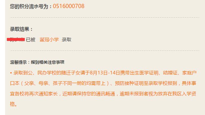 錄取到公、民辦學(xué)校的隨遷子女請于8月13日-14日攜帶出生醫(yī)學(xué)證明、結(jié)婚證、家庭戶口本(父親、母親、孩子不同一冊的均需帶上)、預(yù)防接種證明至錄取學(xué)校報到,具體事宜各校將再次通知家長,近期請保持您的通訊暢通
