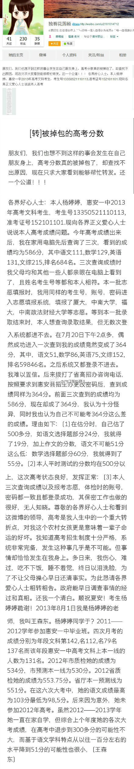【福建考生高考成績被調(diào)包?!】惠安一中今年考生楊婷婷在成績公布時查詢?yōu)?86分,一本錄取結(jié)束再查詢成績變成364分,懷疑成績被調(diào)包的微博在網(wǎng)上引起大量轉(zhuǎn)發(fā)。福建省考試院今天下午將向媒體就此作出說明,據(jù)記者@陳強微博 了解,查分的結(jié)果該考生就是364分,其作文卷面空白(幫轉(zhuǎn)求真相)