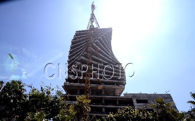 8月11日,廈門街頭一造型獨特的大樓在烈日下顯得蔚為壯觀。
