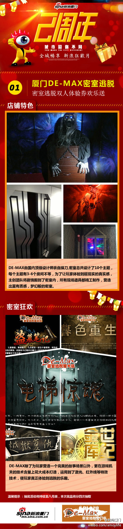 #新浪廈門兩周年#【@廈門De-Max密室逃脫 雙人體驗券大派送!】電影里才有的精密道具、光怪陸離的激光迷霧、巧妙趣味的故事情節(jié)…即日起至8月15日11:00AM,關(guān)注@時尚廈門@廈門De-Max密室逃脫 轉(zhuǎn)發(fā)并@ 3好友,就有機會獲得雙人體驗券一份(總5份),快來挑戰(zhàn)最潮最碉堡的密室逃脫吧!
