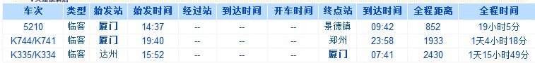 K335/K334 臨客 達(dá)州 15:52 -- -- -- 廈門(mén) 07:41 2430 1天15小時(shí)49分