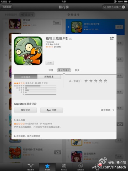 【植物大戰(zhàn)僵尸2中國(guó)水土不服】上線7小時(shí)便躥升至蘋果商店下載排行第一名,同時(shí)評(píng)價(jià)卻從5星直降至2星!吨参锎髴(zhàn)僵尸2》的本土化之路下載量與罵聲齊飛。出現(xiàn)這種反差原因在于《植物大戰(zhàn)僵尸2》中文版難度和內(nèi)購(gòu)價(jià)格比英文版高出數(shù)倍,這種差別待遇激怒了中國(guó)玩家