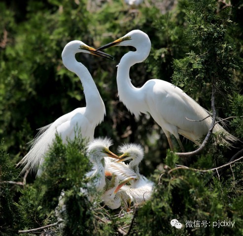 鷺鳥的婚配也很有趣。雄鷺到了春天,頭上長出兩條狹長而柔軟的白色或黑色矛狀羽,狀若兩只小辮,還會伸長像蛇一樣的脖子,踏著奇異的舞步,以鳴叫聲贏得雌鳥的青睞。