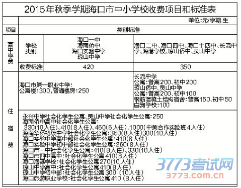 海南日報(bào)?8月28日訊(記者李佳飛 實(shí)習(xí)生馮定輝)隨著今年秋季學(xué)期開學(xué)日期的臨近,日前,海口市教育局、物價(jià)局和財(cái)政局聯(lián)合下發(fā)2015年秋季學(xué)期海口市中小學(xué)校收費(fèi)項(xiàng)目和標(biāo)準(zhǔn)。
