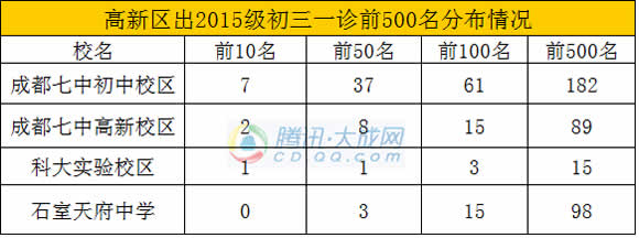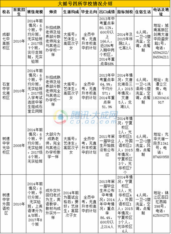由表可以看出從成熟性方面看樹德中學(xué)光華校區(qū)最為成熟,從師資看樹德中學(xué)外國語校區(qū)師資最強(qiáng),從知道的中考成績看成都七中高新校區(qū)及樹德中學(xué)外國語校區(qū)相對要強(qiáng)一點(diǎn),從生源整齊度看樹德中學(xué)外國語校區(qū)由于有面試,在整個(gè)成都市行政范圍面試合格后的搖號,相對其他三個(gè)大搖號學(xué)校來說最為整齊(2014年不再進(jìn)行面試),所以2014年中考情況樹德中學(xué)外國語學(xué)校出口成績最好,這基本是生源決定的;從硬件設(shè)施看樹德中學(xué)光華校區(qū)由于修建時(shí)間相對其他幾個(gè)市屬學(xué)校來說相對要薄弱一點(diǎn)。