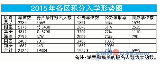 積分入學的申請者過分集中在局部,即思明、湖里、集美、海滄都人滿為患,其次,即使學位多于報名人數(shù)的區(qū),學位大多集中在偏僻小學,城區(qū)也是爆滿。