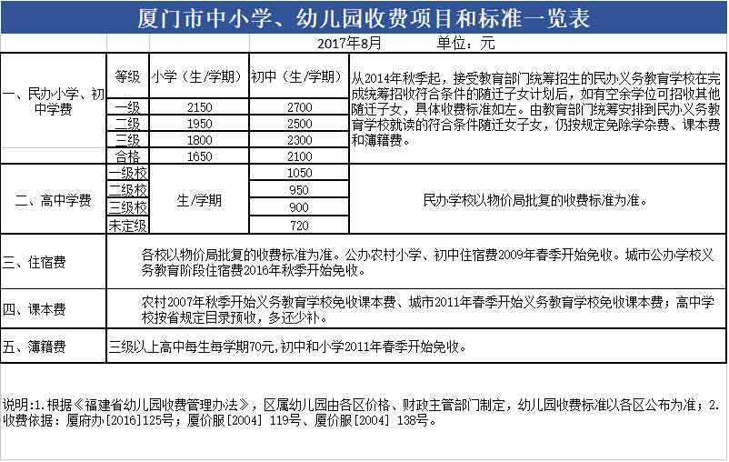 2017年廈門中小學幼兒園收費項目和標準一覽表