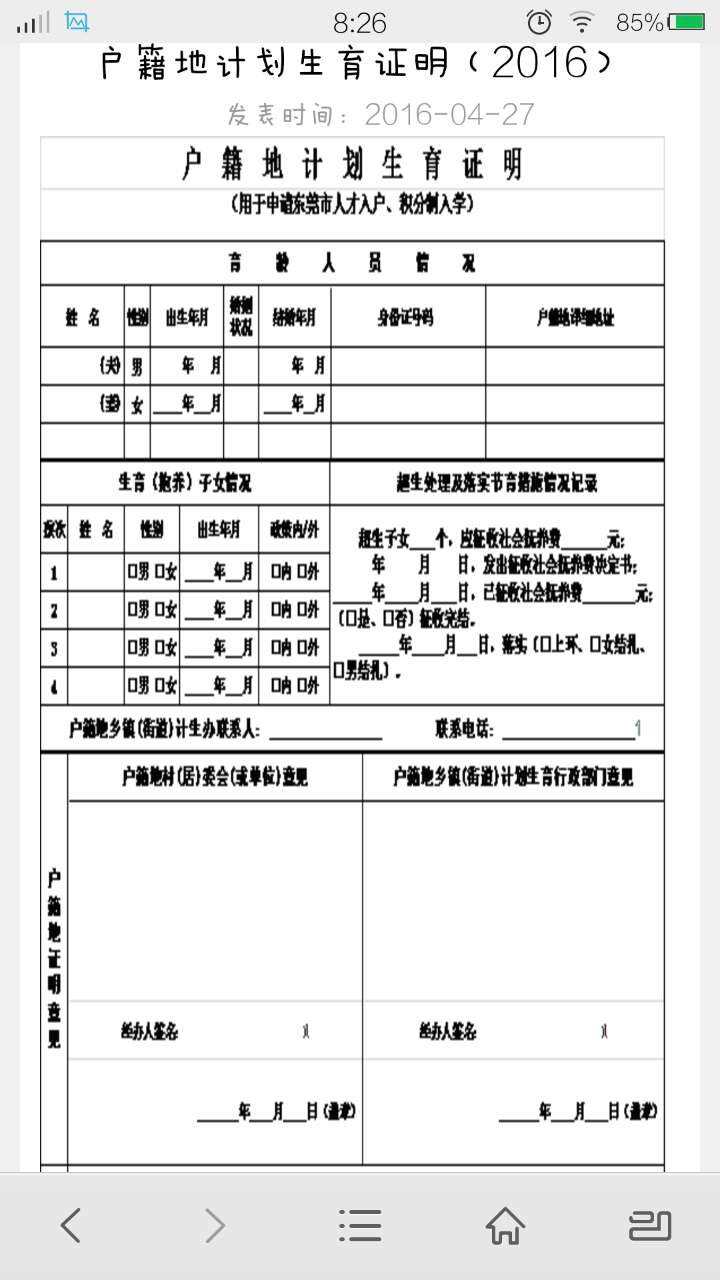 2017東莞積分入學(xué) 戶籍地計(jì)劃生育證明表格下載