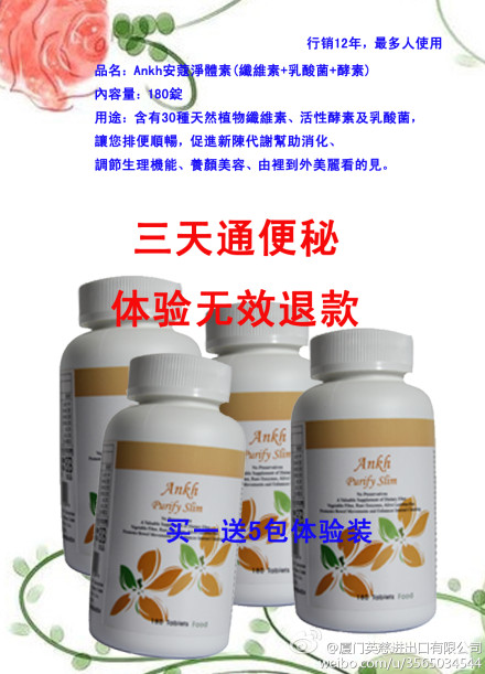 美國(guó)進(jìn)口,臺(tái)灣分裝的安寇凈體素三天解除便秘,清除體內(nèi)毒素、減肥、美容養(yǎng)顏、很好減輕身體負(fù)擔(dān) 加微博可免費(fèi)領(lǐng)取 0592-8509008 地址:廈門(mén)翔鷺國(guó)際酒店121店面