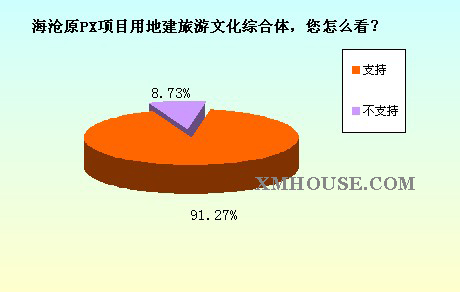 本網(wǎng)8月7日、9日相繼發(fā)布《海滄原PX項(xiàng)目用地將建旅游文化綜合體 翔鷺石化外遷》、《海滄原PX項(xiàng)目用地將建旅游綜合體 今年有望開建》的新聞,其中文中指出,根據(jù)海滄的規(guī)劃,位于規(guī)劃區(qū)的中部臨港新城文化里的原PX項(xiàng)目用地,將建成旅游文化綜合體,并有望于今年動(dòng)工建設(shè)。本網(wǎng)發(fā)起的“海滄原PX項(xiàng)目用地建旅游文化綜合體,您怎么看?”的調(diào)查,共有573名網(wǎng)友參與,結(jié)果顯示,91.27%的網(wǎng)友支持海滄原PX項(xiàng)目用地建旅游文化綜合體。